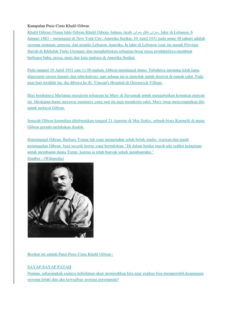 Dibawah ini telah kami sajikan artikel yang berkaitan dengan kata bijak rindu khalil gibran sebagai salah satu referensi dan perbandingan harga. Ia lahir pada tanggal 6 januari 1883 dan menghembuskan nafas terakhirnya pada tanggal 10 april 1931 di new york amerika serikat.